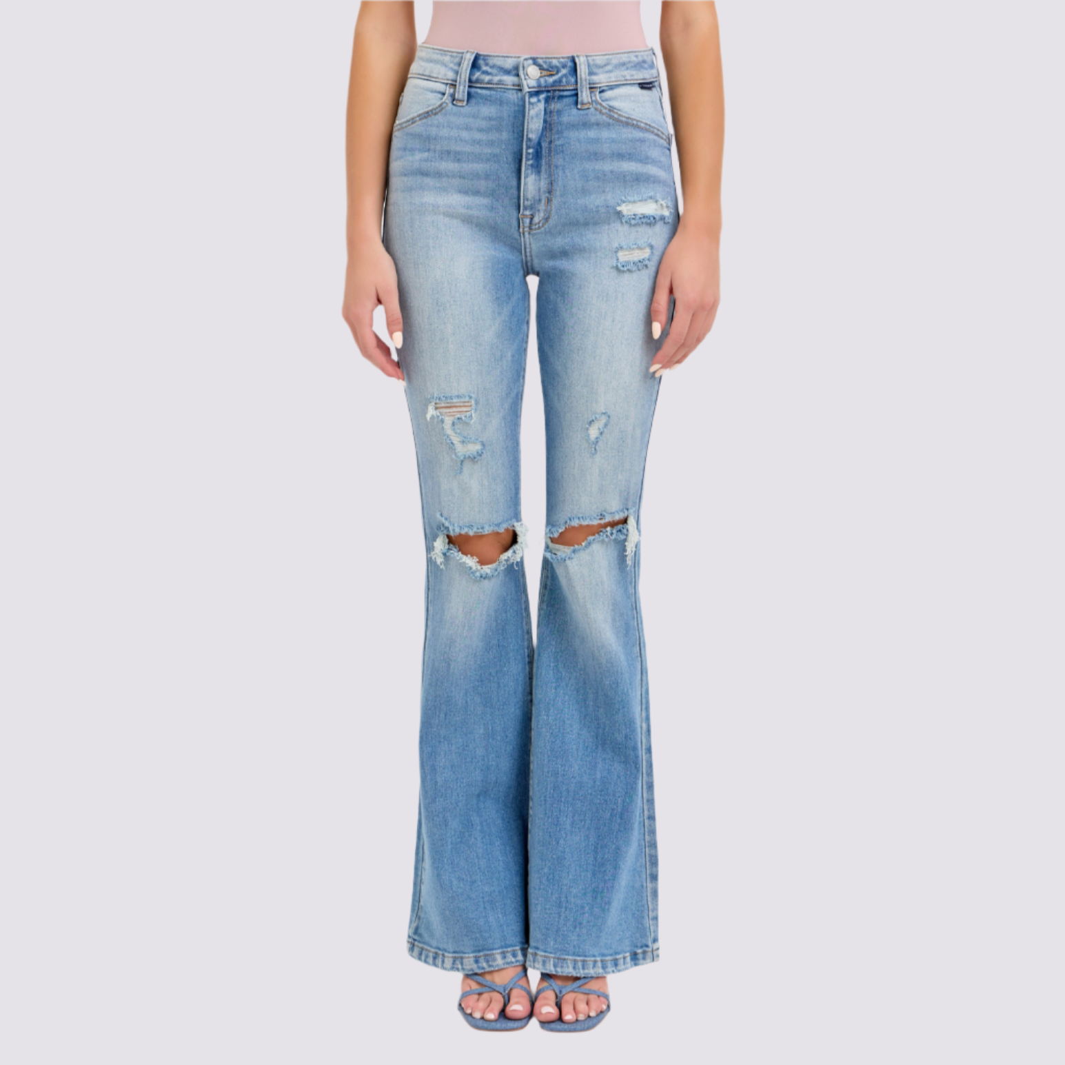 Introducing the Bridgette Flare Jeans, the perfect combination of style and comfort. These high rise jeans feature a trendy flare cut and distressed details, giving you a chic and edgy look. Made with high quality materials, they offer both durability and fashion. Upgrade your wardrobe with these must-have jeans today.