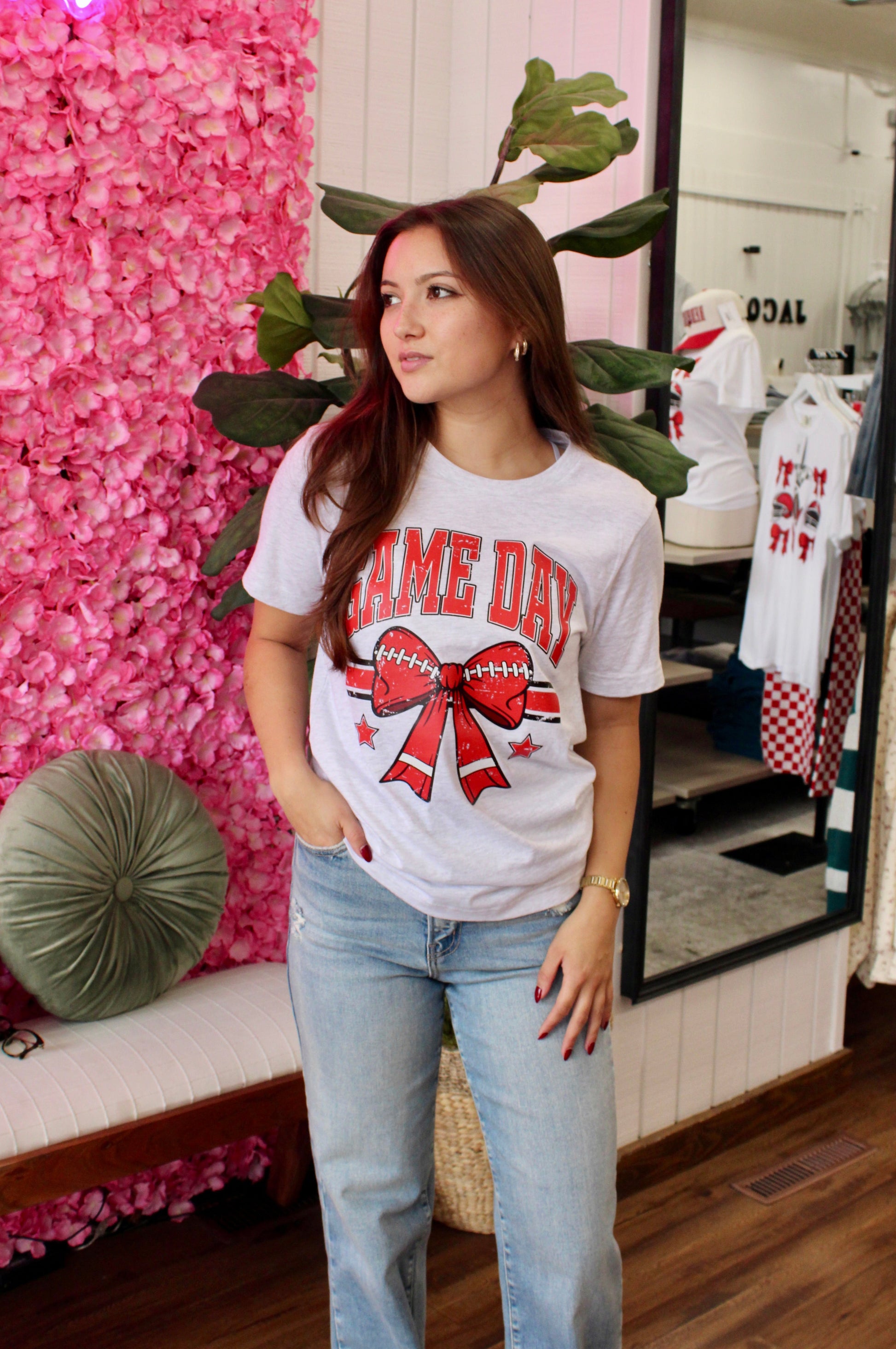 Elevate your game day wardrobe with the Game Day Bow Tee, designed for both comfort and style. Crafted from soft, breathable fabric, this tee offers a relaxed fit that allows easy movement, perfect for cheering on your team. Its subtle bow detail adds a refined twist to a classic look, making it ideal for layering.