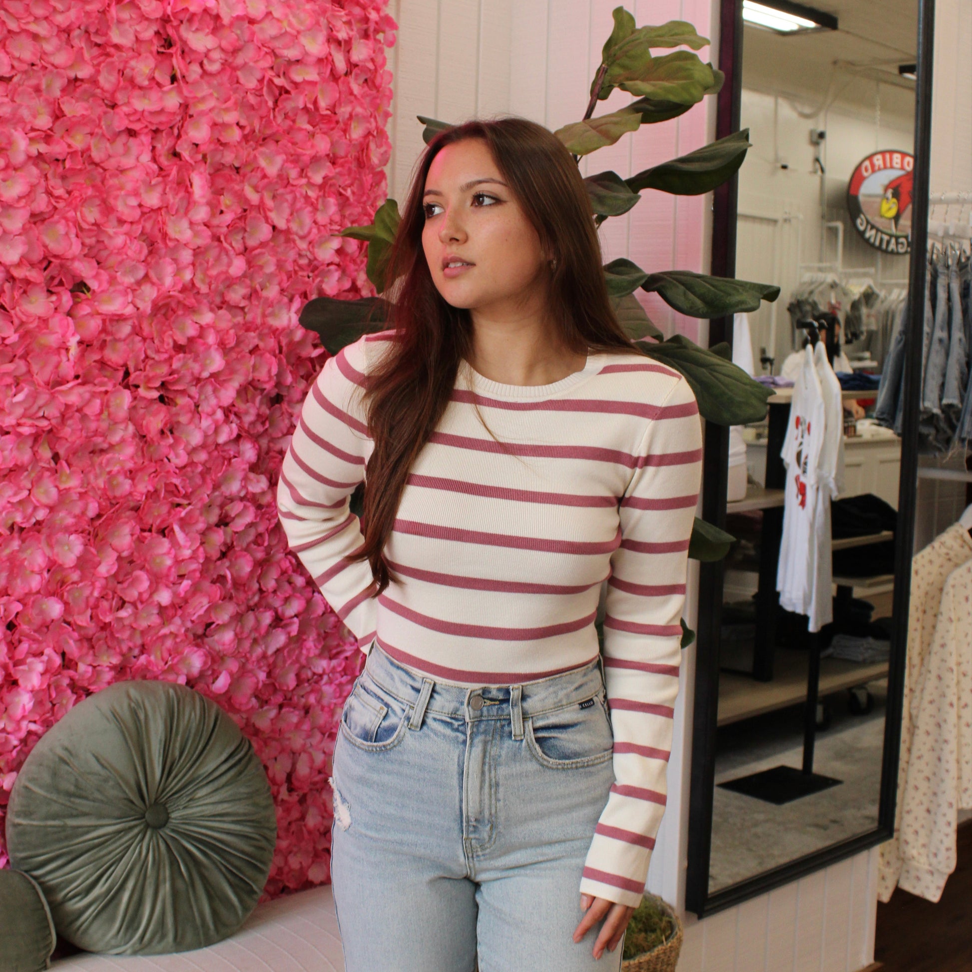The Mikayla Stripe Knit Bodysuit features a refined white and blue striped pattern crafted from a soft, breathable knit fabric. Designed for both comfort and style, this bodysuit offers a sleek fit that moves with you, making it ideal for layering or wearing alone. Its tailored construction ensures a flattering silhouette, while the durable knit material provides lasting wear throughout the day. Perfect for casual or polished looks, the Mikayla Stripe Knit Bodysuit combines timeless design with expert craftsmanship.