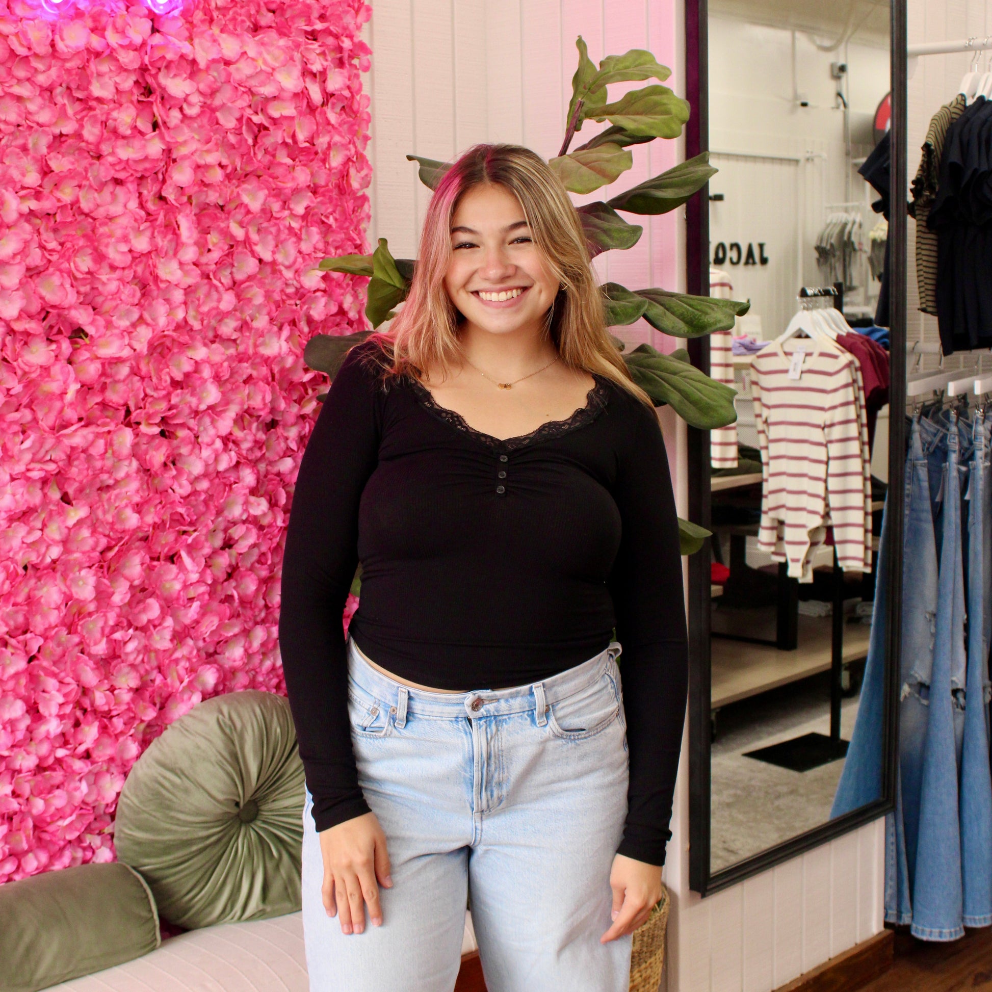Elevate your wardrobe with the Romina Lace Trim Long Sleeve Top, featuring delicate black lace along the collar for a refined finish. Crafted with precision, its long sleeves offer a sleek and polished silhouette, perfect for professional or evening wear. This top combines elegance with subtle detailing to enhance your outfit effortlessly.